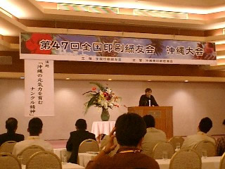 暖かな気候と青く澄み渡った空と海を眺めていると自然と肩の力が抜けていくようなそんな心地になります。?「なんくるないさ」?今大会のテーマが意味す る事、気張らず、どーんと構えようきっと良い結果はめぐってくるよ。厳しい経済環境の昨今ですが、緑友の仲間だからこそ今大会で友情・懇親が一層深めら れたと確信しました。
